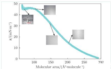 圖2為膜表面壓強(qiáng)隨膜密度的變化曲線,(以DPPC磷脂分子所占平均面積作為衡量膜密度的物理量)。在顯微鏡下觀察了膜在不同密度下的形貌(圖2中4張照片)。膜被壓縮到100?2/molecule之前,處于液態(tài)擴(kuò)張(Liquid Expanded,LE)相,磷脂分子排列較松散,膜表面結(jié)構(gòu)均勻。當(dāng)膜被壓縮到60~100?2/molecule時,膜上開始出現(xiàn)直徑為幾微米的磷脂凝聚(Tilted Condensed,TC)相(照片中斑點),TC區(qū)域內(nèi)磷脂分子的排列比LE區(qū)域更緊密。熒光劑Texas red DHPE傾向于分布在LE區(qū)域,因此LE區(qū)域顯示為淺色,TC區(qū)域顯示為深色。膜繼續(xù)被壓縮,在LE?TC共存相階段,膜表面壓強(qiáng)恒定在45 mM/m左右,TC區(qū)域數(shù)量和面積占比增大。當(dāng)膜被進(jìn)一步壓縮(<60?2/molecule),此時膜表面幾乎被TC區(qū)域占據(jù),TC區(qū)域相互擠壓,導(dǎo)致膜表面壓強(qiáng)直線上升,LE區(qū)域僅存在于TC區(qū)域之間的空隙。