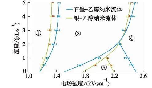 流量是影響納米流體霧化特性的另一重要參數(shù)。尋找在較大流量下依然能保持穩(wěn)定霧化效果的區(qū)間,對工業(yè)應用具有十分重要的意義。質(zhì)量分數(shù)為0.1%的納米流體在不同流量下霧化模式隨電壓的變化區(qū)間如圖3所示,區(qū)間①為滴狀模式,區(qū)間②為紡錘模式,區(qū)間③為錐射流模式,區(qū)間④為多股射流模式。相同電場強度下隨著流量的增加,單位體積流體荷電量也隨之減小。因此,流體從滴狀模式進入紡錘模式所需電場強度逐漸升高(圖3區(qū)間①→②)。由圖3區(qū)間②可知,隨著流量的增大紡錘模式所占區(qū)間逐漸增大。低流速(<2μL·s-1)狀態(tài)下,電場強度增大,流體表面集聚大量電荷,致使液體表面張力降低,霧化模式也就從紡錘模式逐步向錐射流模式過渡(圖3區(qū)間②→③)。納米流體的錐射流模式僅僅發(fā)生在流量低于2μL·s-1時,并且隨著流量的增大,錐射流模式所在區(qū)間迅速減小直至消失(圖3區(qū)間③)。電場對流體荷電的能力有限,流量的增加使得流體不穩(wěn)定性增大,大部分電荷無法聚集至液錐表面,從而導致錐射流模式隨著流量的增大,其霧化區(qū)間迅速消失。