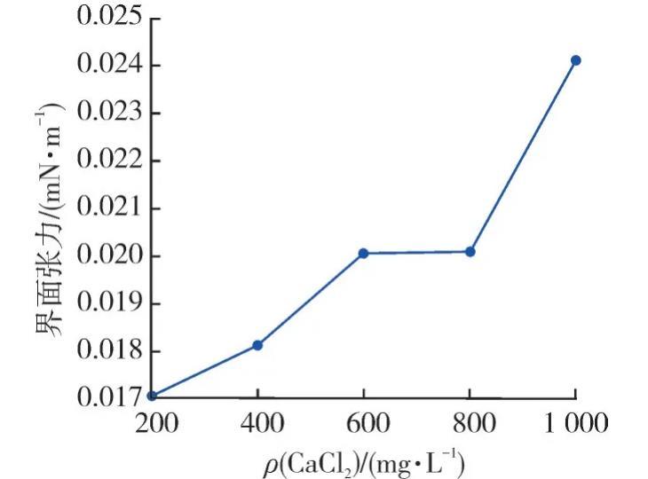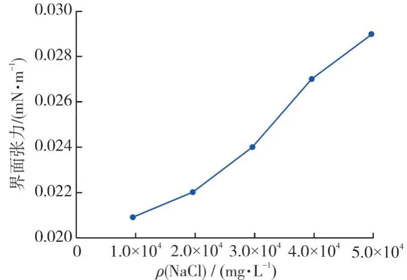 由圖4和5可知:隨著Na+濃度的增加,復(fù)配體系的油水界面張力值雖然不斷上升,但是當(dāng)?shù)V化度上升至50 000 mg/L時,界面張力值增幅很小,僅增加了0.008 mN/m。當(dāng)Ca2+質(zhì)量濃度增加至1 000 mg/L時,界面張力值增幅也很小,僅上升了0.007 mN/m。這兩種現(xiàn)象證明了隨著礦化度的增加,復(fù)配體系仍然具有較好的抗鹽性能,這也正是非離子表面活性劑的特點。