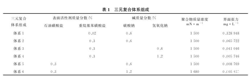 (4)實(shí)驗(yàn)用三元復(fù)合體系的組成見表1,界面張力分布在3個(gè)數(shù)量級(jí)。