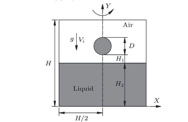 如圖1所示,水滴撞擊深水液池的數值模擬在軸對稱坐標系中進行,Y軸為計算區域的對稱軸,D為初始水滴直徑,R=D/2,正方形計算區域的長度H=20D,水滴距離液面的距離H1=0.1D,液池深度H2=12D以消除底部對液滴撞擊運動的影響,水滴在重力g和撞擊速度Vi的作用下撞擊液池。采用雷諾數、韋伯數和弗勞德數來描述液滴撞擊的運動特征,三者分別表征液體慣性力與黏滯力間的關系、液體慣性力與表面張力間的關系以及液體慣性力與重力間的關系。三個無量綱參數的表達式如(7)式所示,主要物理參數如表1所列。