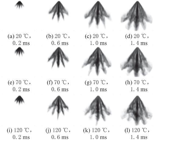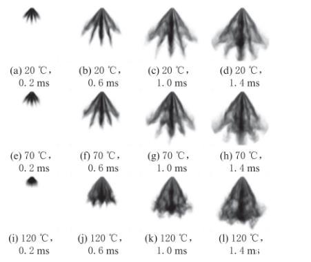 圖4不同環(huán)境溫度和噴霧開(kāi)始后時(shí)刻下甲醇的噴霧形態(tài)