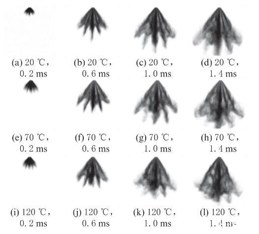 圖6不同環(huán)境溫度和噴霧開(kāi)始后時(shí)刻下正丁醇的噴霧形態(tài)