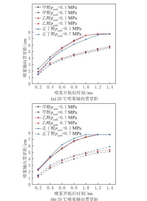 在試驗(yàn)中發(fā)現(xiàn),高溫高壓的環(huán)境對(duì)噴霧形態(tài)產(chǎn)生了較大的改變,相比于單種工況,環(huán)境溫度和背壓共同對(duì)噴霧形態(tài)有著更復(fù)雜的影響。圖8為3種醇類燃料在不同溫度(20℃、70℃、120℃)、不同背壓(0.1 MPa、0.7 MPa)的環(huán)境下,噴射壓力為20 MPa時(shí)的噴霧軸向貫穿距的變化。