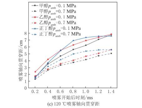 環(huán)境溫度升高至70℃、120℃時(shí),正如圖8(b)和圖8(c)呈現(xiàn)出的,正丁醇的噴霧軸向貫穿距高于甲醇和乙醇,這與常溫常壓的環(huán)境條件下完全相反。盡管正丁醇的潛熱較低,但環(huán)境溫度和壓力的升高使甲醇和乙醇的過(guò)熱度高于正丁醇,進(jìn)而引發(fā)更高的顯熱,提升了甲醇和乙醇的蒸發(fā)率,導(dǎo)致醇束發(fā)展緩慢。