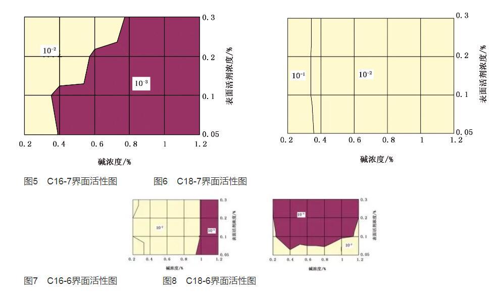 1)碳鏈長度對界面活性的影響對用濃度為1500mg/L的聚合物和不同碳鏈長度的烷基苯磺酸鹽配置的弱堿三元復合體系進行界面活性檢測(見圖5~圖8)。圖5和圖1對比表明,帶有支鏈的C16烷基苯磺酸鹽形成超低界面張力時堿濃度和表面活性劑濃度范圍較寬;圖6和圖4對比表明,帶有支鏈的C18烷基苯磺酸鹽在相同濃度范圍內沒有形成超低界面張力。因此,帶有支鏈的C16烷基苯磺酸鹽界面活性好于帶有支鏈的C18烷基苯磺酸鹽。