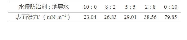 參照石油天然氣行業(yè)標(biāo)準(zhǔn)SY/T 5370—2018《表面及界面張力測(cè)定方法》中“圓環(huán)法”的要求,測(cè)定水侵防治劑與地層水按不同比例(體積比)混合后的表面張力值,結(jié)果見(jiàn)表1。可以看出,隨著水侵防治劑溶液比例的逐漸增大,溶液的表面張力值逐漸減小,當(dāng)水侵防治劑與地層水按5∶5混合時(shí),表面張力即可以降低至30 mN/m以下,說(shuō)明水侵防治劑具有良好的降低表面張力的能力,從而有助于氣井解堵措施后的返排,提高施工效率。