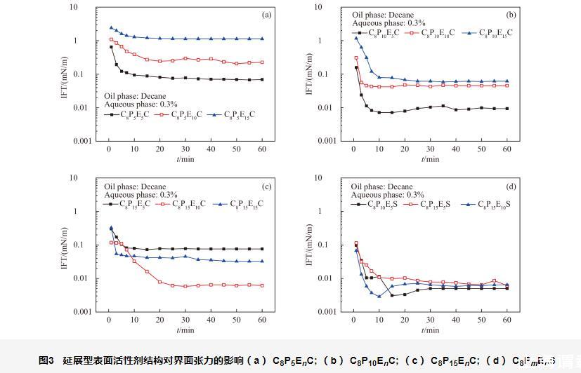 其它延展型表面活性劑溶液界面張力隨質(zhì)量分?jǐn)?shù)的變化趨勢與C8P15E10C類似,不再列出。因此,選擇溶液質(zhì)量分?jǐn)?shù)為0.3%進(jìn)行后續(xù)的結(jié)構(gòu)-活性關(guān)系研究。