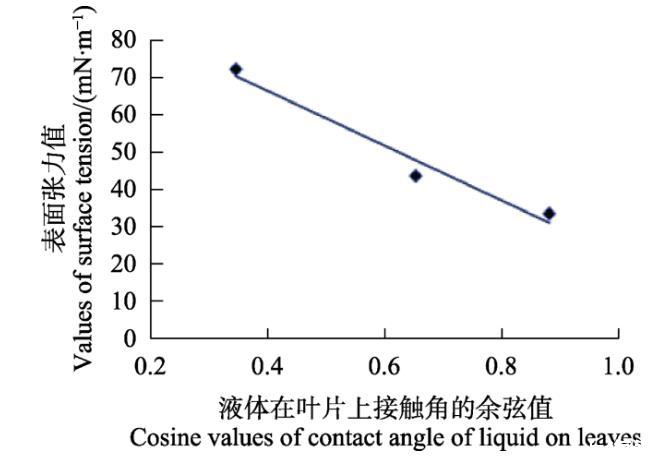 采集新鮮的芒果葉片,新老葉比例1∶1,取其平整部分且不破壞其葉面結構,用雙面膠將其固定在載玻片上構成平面,使葉面保持自然狀態(tài)。分別將水、二甲基甲酰胺(DMF)、二甲基亞砜(DMSO)3種液體通過微量注射器滴加到葉面上,當液體在葉面形成液滴后,通過接觸角測定儀拍照后測量其接觸角。從滴加樣品到測得接觸角在5 s內(nèi)完成,每個處理重復10次,取平均值。液體的表面張力值通過表面張力儀測定,每個處理重復5次,取平均值。將測得的水、DMF、DMSO液體表面張力值和接觸角的cosθ值分別為橫縱坐標作圖,獲取回歸方程,當接觸角為零時求得芒果葉的臨界表面張力值。為確保液滴的完整性和穩(wěn)定性,整個測定過程的溫度保持在25~28℃,相對濕度為80%左右的封閉環(huán)境下進行。
