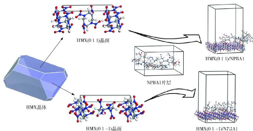 由于實際HMX以晶體的形式存在,因此在建立HMX吸附NPBA界面模型時,首先根據β-HMX的晶體衍射數據,構建HMX初始晶胞,模擬HMX的晶體形貌,確定HMX晶體的主要晶面后,擴建超晶面;然后,建立包含1條分子鏈的NPBA片層模型,將超晶面與片層模型復合,構建HMX吸附NPBA的6個界面模型,具體細節如2.1.1節中所述。3種NPBA的分子結構式及其模型見圖1,HMX超晶面、NPBA片層模型及界面模型見圖2,其余略。