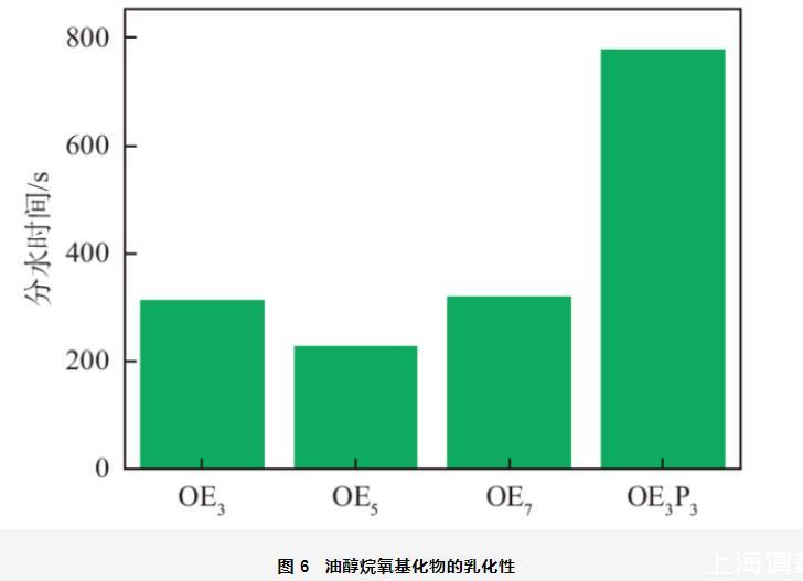 乳液是是熱力學(xué)不穩(wěn)定體系,乳液穩(wěn)定性可以通過測定發(fā)生乳化作用后分出一定體積水所需時間來表示,分水時間越長,乳化性能越好。油醇烷氧基化物的乳化性如圖6所示。OE3、OE5和OE7乳化液體石蠟的分水時間分別為313,228和319 s。當(dāng)OEn中EO加合數(shù)由3增加到5時,其分水時間明顯降低,乳化性降低。這是因?yàn)镋O基團(tuán)為親水基團(tuán),當(dāng)EO基團(tuán)增加時,表面活性劑分子的親水性增加,與疏水性的液體石蠟相互作用減弱,乳化性降低。當(dāng)EO加合數(shù)由5繼續(xù)增加到7時,其分水時間又顯著增大,乳化性增強(qiáng)。這是因?yàn)楫?dāng)EO基團(tuán)的加合數(shù)較大時,EO基團(tuán)具有一定的疏水性,表面活性劑分子與液體石蠟相互作用增強(qiáng),乳化能力提高。從圖中還可以看出,當(dāng)在OE3中引入PO基團(tuán)后,OE3P3乳化液體石蠟的分水時間為778 s,乳化性顯著增強(qiáng),這是因?yàn)镻O基團(tuán)是疏水性基團(tuán),且具有一定的支化結(jié)構(gòu),當(dāng)分子中引入PO基團(tuán)后,使其更容易“插入”油相,增強(qiáng)表面活性劑分子與油相液體石蠟之間的相互作用,乳化性顯著增強(qiáng)。