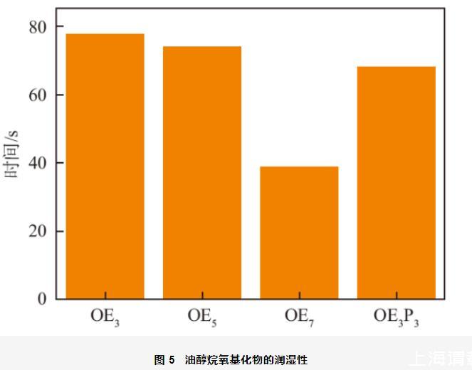 采用帆布片沉降法進(jìn)行潤濕性測定過程中,帆布片在表面活性劑溶液中的沉降時間越短,潤濕力越好。0.01 mol/L油醇烷氧基化物的潤濕性如圖5所示。從圖中可以看出,隨著EO加合數(shù)的增加,OEn的潤濕時間逐漸減小,潤濕性逐漸增強(qiáng)。當(dāng)帆布片浸入表面活性劑溶液中后,表面活性劑首先從溶液中快速遷移到纖維表面形成有效吸附層,表面活性劑的尾鏈會吸附在疏水表面上,而親水頭基朝向水相產(chǎn)生親水現(xiàn)象,有利于潤濕。EO基團(tuán)為親水基,分子結(jié)構(gòu)中EO基團(tuán)越多,表面活性劑分子與水的相互作用越強(qiáng),潤濕性越強(qiáng)。當(dāng)在OE3中引入PO基團(tuán)后,潤濕時間由78 s降低至68 s,潤濕性增強(qiáng)。PO基團(tuán)為中等極性基團(tuán),分子中引入PO基團(tuán)后,既不減弱分子的親水性又提高了其疏水性,使其與纖維的相互作用增強(qiáng),同時PO基團(tuán)的支化結(jié)構(gòu)有利于其在織物表面的滲透,增強(qiáng)了潤濕性。表面活性劑分子在水溶液中遷移的速率越快(動態(tài)表面活性越強(qiáng)),越容易擴(kuò)散到纖維表面,越有利于潤濕。油醇烷氧基化物的潤濕性順序?yàn)椋篛E3<OE5<OE3P3<OE7,與動態(tài)表面張力測定結(jié)果一致。