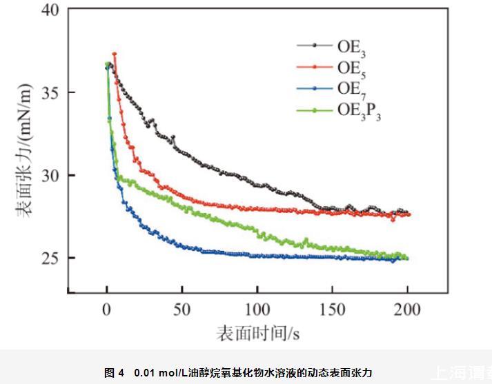 圖4為0.01 mol/L油醇烷氧基化物的動態(tài)表面張力。從圖4中可以看出,相同表面時間時油醇烷氧基化物動態(tài)表面張力的大小順序?yàn)椋篛E3>OE5>OE3P3>OE7,即其降低水的表面張力的能力順序?yàn)椋篛E3<OE5<OE3P3<OE7。隨著OEn分子結(jié)構(gòu)中EO加合數(shù)的增加,其動態(tài)表面活性增強(qiáng);在OE3分子中引入PO基團(tuán)可以提高其動態(tài)表面活性。這與李本鋼等人報道的“親水基團(tuán)相同時,表面活性劑分子親油性越強(qiáng),動態(tài)表面活性越高”是一致的。從圖4還可以看出,當(dāng)表面時間為3 s時,油醇烷氧基化物的動態(tài)表面張力為36~37 mN/m,該值顯著低于相同濃度、相同表面時間時C12EO6和C12EO8的動態(tài)表面活性(60 mN/m),這可能是由于油醇烷氧基化物具有較強(qiáng)的疏水性所致;另外,該值也顯著低于相同濃度、相同表面時間時陰離子表面活性劑OEnS(n=3,5,7)的動態(tài)表面張力(65 mN/m),這是因?yàn)榉请x子表面活性劑分子的吸附勢壘小于離子型表面活性劑。