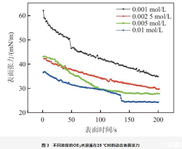 圖3不同濃度的OE3水溶液在25℃時的動態(tài)表面張力