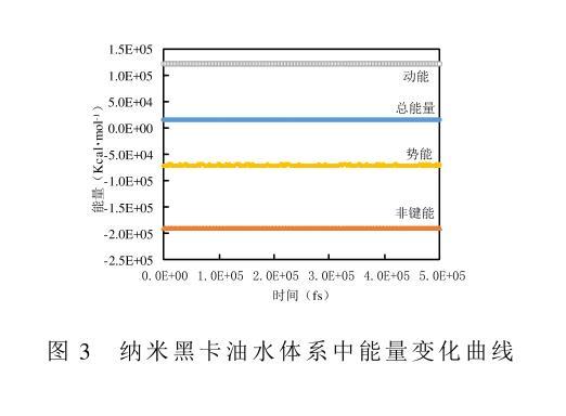 采用粒子-粒子-粒子-網(wǎng)格(PPPM)求解方法求解長(zhǎng)程庫(kù)倫相互作用力。運(yùn)用Polak-ribiere共軛梯度(CG)算法最小化能量,消除構(gòu)型重疊。系統(tǒng)溫度為298 K,壓力為1 atm,系統(tǒng)在等溫-等壓系綜(NPT)下進(jìn)行弛豫,對(duì)體系進(jìn)行壓縮,使模型達(dá)到實(shí)際密度狀態(tài)。使用Nosé-hoover恒溫器控制體系溫度,時(shí)間步長(zhǎng)1 fs,運(yùn)行1 ns。然后保持系統(tǒng)體積不變,設(shè)置相同的時(shí)間步長(zhǎng)和時(shí)間總長(zhǎng)運(yùn)行正則系綜(NVT)來(lái)穩(wěn)定體系,以確保體系的密度不變。最后,收集體系平衡后0.5 ns范圍內(nèi)的數(shù)據(jù),得到統(tǒng)計(jì)平均值。應(yīng)該注意的是,在每個(gè)階段運(yùn)行更長(zhǎng)時(shí)間并不會(huì)對(duì)模擬結(jié)果產(chǎn)生明顯的變化。模擬中水相和油相的平均密度分別為(0.989±0.008)和(0.728±0.002)g/cm3,近似實(shí)驗(yàn)值(溫度為298 K、壓力為1 atm時(shí),水和C10H22的密度分別為:0.997和0.730 g/cm3)。模擬結(jié)束后,單片納米黑卡在油水界面體系中的能量變化如圖3所示,其他體系能量變化亦有此規(guī)律。