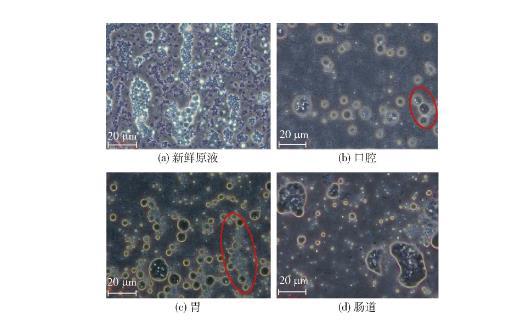 圖7是通過(guò)光學(xué)顯微鏡拍攝的模擬消化后各階段乳液的形態(tài)。圖7(a)顯示,消化前乳液粒徑大小適宜且分布密集,其中高亮處的乳液粒徑較大,此時(shí)乳液具有良好的穩(wěn)定性;圖7(b)顯示,經(jīng)口腔模擬消化后的乳液分布較為稀疏,但仍存在W1/O/W2雙重乳液結(jié)構(gòu);觀察圖7(c),經(jīng)模擬胃消化后的乳液整體粒徑較大且分布相較于圖7(b)密集,同時(shí)觀察到中小液滴高密度堆積成帶,說(shuō)明在強(qiáng)酸和胃蛋白酶存在下,雙重乳液傾向于聚結(jié)在一起,這一結(jié)果增加了液滴間的聚集率,進(jìn)而導(dǎo)致乳液粒徑增大;圖7(d)結(jié)果顯示,經(jīng)模擬腸道消化后的乳液失去原有的多相結(jié)構(gòu),高度聚結(jié)后的乳液破裂后釋放出W1/O型液滴,又堆積形成大小、形狀不一的大液滴,部分微粒粒徑增大到5 600 nm,而油相經(jīng)膽鹽的乳化作用進(jìn)一步會(huì)形成更小的油滴。實(shí)驗(yàn)結(jié)果表明,經(jīng)模擬口腔、胃消化后的乳液仍具有良好的雙重乳液結(jié)構(gòu),而乳液由于聚集作用,粒徑逐漸增大,最終在模擬腸道消化階段,雙重乳液結(jié)構(gòu)破壞,釋放出的W1/O型乳液在胰酶的作用下分解并釋放出LOPs。