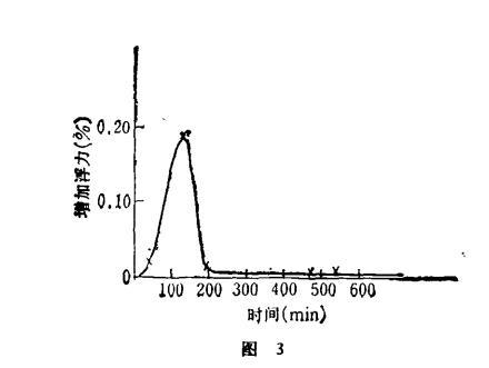 測試條件:水流速v=0.745m/s;水溫T=18.0±0.3℃;電場頻率3.5MHz;用長春市自來水。測試時間為1984年9月21日。電水的浮力和時間關(guān)系見圖3。