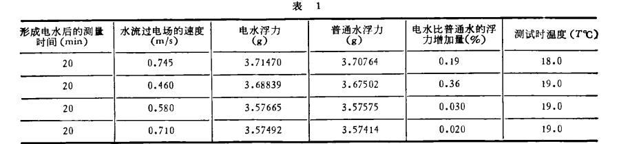 用自制電水器形成電水,用精度為0.1mg的電光天平測定電水和普通水的浮力。實驗用水是長春市自來水和深井水,測試時只要保證水溫和環(huán)境溫度穩(wěn)定,數(shù)百次實驗證實,電水浮力比普通水浮力增加,重復(fù)性規(guī)律較好。現(xiàn)選四組數(shù)據(jù)列于表1。