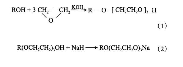 EO數(shù)為3的C14脂肪醇聚氧乙烯醚(3)磺酸鹽(C14EO3S)、C16脂肪醇聚氧乙烯醚(3)磺酸鹽(C16EO3S)、C18脂肪醇聚氧乙烯醚(3)磺酸鹽(C18EO3S)按文獻(xiàn)[1]報(bào)道的方法合成,產(chǎn)物經(jīng)兩相滴定法測定磺酸鹽含量,純度均達(dá)到95%以上。合成反應(yīng)見式(1)~(3)。