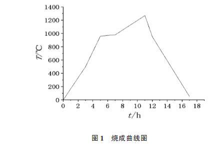 把磨好的釉料制成2cm×2cm×3cm正四棱柱試樣,置于窯門洞口內(nèi),借助于高溫顯微鏡可連續(xù)觀察其在加熱過程中的全部變化。本次實(shí)驗(yàn)采用還原氣氛進(jìn)行燒制,實(shí)驗(yàn)最高燒成溫度為1270℃,氧化和還原氣氛轉(zhuǎn)換溫度為980℃,圖1為燒成曲線圖。