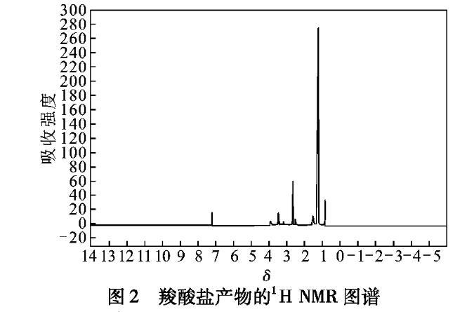 2.1.21H NMR分析因為終產物的分子結構是完全對稱的,故只討論其結構的一半。終產物的1H NMR(CDCl3)數據如下:δ:0.84~0.87[d,3H,CH3—],1.23~1.25[d,22H,CH3—(CH2)11—],1.51~1.55[m,2H,—CH2—COO—],2.50~2.68[d,6H,N—(CH2)3—N],3.21[t,1H,—CH2—NH—CH2—],3.45~3.49[d,5H,N—CH2—CH—CH2—N],3.93[m,1H,—CH—OH]。1H NMR的數據證明了產物中主要官能團氫原子的歸屬,與目標產物分子結構相吻合。