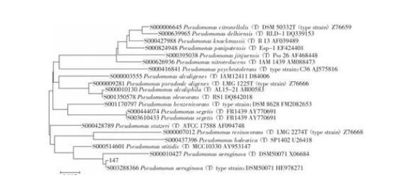 觀察菌株培養特征及形態特征,可見菌體細長且長短不一,菌落較小,為扁平、濕潤的菌落。部分生理生化指標如表2。經16S rDNA測試并與GenBank中已登錄的核苷酸序列號進行同源性比較,發現菌株147與Pseudomonas aeruginosa DSM50071同源性為99%,采用MEGA 5.10軟件NJ方法構建147的16S rDNA系統發育樹見圖1。結合生理生化特征結果,將菌株147鑒定為銅綠假單胞菌(Pseudomonas aeruginosa),該菌株GenBank登錄號為KU921686。