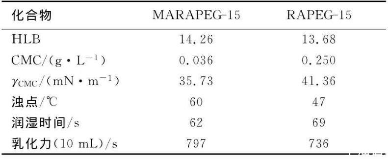 b.對MARAPEG-15和RAPEG-15的表面性能進行了測定與比較。MARAPEG-15的表面性能優于其單酯產品RAPEG-15,其表面張力及臨界膠束濃度較低,乳化性能和潤濕性能優良,可作為水包油型乳化劑。