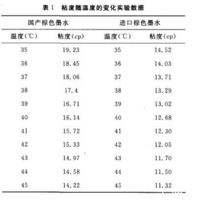 從圖1分析得出,陶瓷墨水的粘度隨著溫度的升高而呈現(xiàn)線性下降趨勢,噴墨生產(chǎn)為了減少環(huán)境變化對噴墨的影響,噴墨二級墨盒(即直接連接噴墨的墨水中轉(zhuǎn)裝置)的溫度一般在35~45℃范圍內(nèi)調(diào)節(jié),正常設(shè)置溫度為40℃。所以,如果生產(chǎn)中出現(xiàn)滴墨的情況,或者出現(xiàn)由于墨水粘度太高造成打印不流暢,可以通過調(diào)節(jié)溫度來調(diào)節(jié)墨水的粘度以及墨水的流動(dòng)性。實(shí)驗(yàn)結(jié)果表明,無論是進(jìn)口墨水還是國產(chǎn)墨水,35℃比45℃時(shí)的墨水粘度一般都高3cp左右。實(shí)驗(yàn)也說明國產(chǎn)墨水的流動(dòng)性能可與進(jìn)口墨水相媲美。