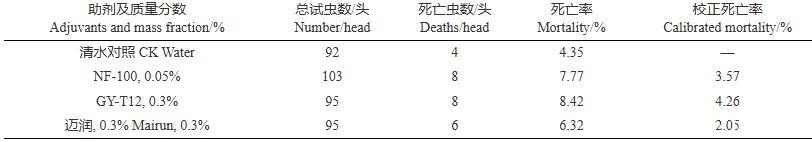 調查了NF-100、GY-T12和邁潤3種助劑對蘋果黃蚜的致死率。結果(表3)顯示:在本研究劑量下3種助劑處理的死亡率均小于10%,各處理間無顯著差異,清水對照校正后死亡率為2.05%~4.26%,因此可以忽略助劑本身對蘋果黃蚜的毒性。在此基礎上,分析了3種助劑對氟啶蟲胺腈的增效作用,結果(表4)表明:未添加助劑時,氟啶蟲胺腈對蘋果黃蚜的LC50值為19.35 mg/L,添加GY-T12、NF-100和邁潤后,對蘋果黃蚜的LC50值分別為9.36、13.06和14.35 mg/L,相對毒力指數(T)分別為2.067、1.481和1.348,均大于1.20,表明3種助劑均對蘋果黃蚜有增效作用;由LC50值的95%置信限可以看出,添加GY-T12的處理與氟啶蟲胺腈單劑無重疊,表明GY-T12可顯著提高氟啶蟲胺腈對蘋果黃蚜的毒力。