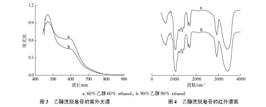 2種皂苷的紫外和紅外光譜見圖3和圖4。由圖3可知,2種皂苷樣品的紫外最大吸收波長均在470 nm附近,且60%乙醇洗脫得到的皂苷吸光度低于90%乙醇洗脫得到的皂苷。