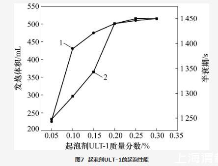 起泡性能主要是指起泡能力和泡沫穩定性。發泡體積V0反映了起泡能力,析液半衰期t1/2反映了泡沫穩定性。在室溫下,稱取一定質量的起泡劑ULT-1于攪拌杯中,加入100 mL蒸餾水,置于攪拌器之上,以轉速11 000 r/min攪拌1 min。攪拌完畢后,立即取下攪拌杯,同時啟動秒表,開始記錄消泡時間,將攪拌杯中的所有物質全部倒入1 000 mL量筒中,讀取發泡體積和從泡沫中析出50 mL液體的時間,即為半衰期。通過改變起泡劑ULT-1的質量測量起泡性能與起泡劑質量分數的關系,結果如圖7所示。從圖7可知:隨起泡劑ULT-1質量分數的提高,發泡體積增加幅度較大,半衰期緩慢增加。當ULT-1質量分數升到0.2%時,發泡體積達到501 mL,半衰期達到1 440 s,繼續提高質量分數發泡體積和半衰期基本不變,表明研制的新型起泡劑ULT-1低濃度時即具有較高的起泡性能,發泡體積高,泡沫半衰期長。同時,對比評價了常用起泡劑的半衰期,結果如表1所示。從表1可知:質量分數為0.2%的起泡劑ULT-1與質量分數為0.5%的常規起泡劑相比,泡沫半衰期可提高3倍以上。