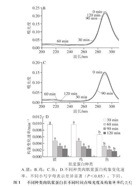 圖1不同種類肉肌漿蛋白在不同時間點吸光度及構(gòu)象速率的變化