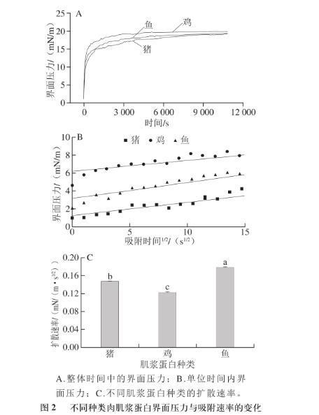 由圖2可知,不同種類肌漿蛋白的動力學(xué)擴散速率間存在差異性。蛋白質(zhì)分子在界面上的擴散速率受其粒徑大小的影響,而本實驗結(jié)果更能解釋這一現(xiàn)象。在前述理化指標(biāo)中,粒徑大小為雞肉肌漿蛋白>豬肉肌漿蛋白>魚肉肌漿蛋白,而在本部分?jǐn)U散速率大小為雞肉肌漿蛋白<豬肉肌漿蛋白<魚肉肌漿蛋白。這可能是由于大粒徑的肌漿蛋白產(chǎn)生的空間位阻在一定程度上削弱了表面疏水性提高帶來的吸附速率增加。而且魚肉肌漿蛋白的擴散速率較豬肉和雞肉肌漿蛋白間顯著較大(P<0.05),但雞肉與豬肉肌漿蛋白之間的擴散速率卻無顯著性差異(P>0.05)。