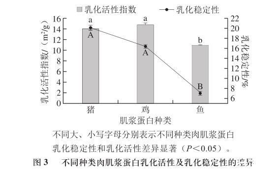 實驗結(jié)果還表明,雞肉肌漿蛋白乳化活性最高,魚肉肌漿蛋白乳化活性顯著低于豬肉和雞肉肌漿蛋白,豬肉肌漿蛋白乳化活性稍低于雞肉但無顯著差異性,這可能是由于肌漿蛋白粒徑及構(gòu)象的不同造成的。但魚肉肌漿蛋白的乳化穩(wěn)定性顯著最差。