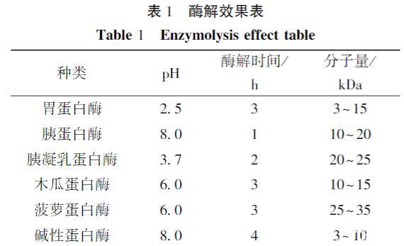 為實(shí)現(xiàn)膠原蛋白肽分子量可控均一,分別比較了胃蛋白酶、胰蛋白酶、胰凝乳蛋白酶、木瓜蛋白酶、菠蘿蛋白酶、堿性蛋白酶的酶解效果,在酶本身最適pH條件下,酶解至分子量不發(fā)生明顯變化,檢測(cè)其酶解后分子量分布(分子量計(jì)算依據(jù)圖1中的標(biāo)準(zhǔn)曲線),結(jié)果見(jiàn)表1。從表中結(jié)果可以看出不同的酶對(duì)膠原蛋白的酶解效果不盡相同,然而均未能達(dá)到控制其分子量在200~5 000 Da的預(yù)期效果。胰蛋白酶酶解速度最快,1 h酶解結(jié)束,而堿性蛋白酶是這幾種蛋白酶中酶解后分子量最小的。因此,將這2種最適pH為8.0的蛋白酶混合,經(jīng)條件優(yōu)化發(fā)現(xiàn)胰蛋白酶。堿性蛋白酶為2:5時(shí),2種酶同時(shí)作用可以在1 h內(nèi)將膠原蛋白酶解至200~5 000 Da(凝膠過(guò)濾色譜檢測(cè)結(jié)果見(jiàn)圖2)。堿性蛋白酶酶切位點(diǎn)為Ala、Leu、Val、Tyr、Phe、Try,胰蛋白酶酶切位點(diǎn)為Arg、Lys,這2種酶的酶切位點(diǎn)無(wú)重疊,從而在酶解過(guò)程中協(xié)同作用,實(shí)現(xiàn)了快速高效酶解。