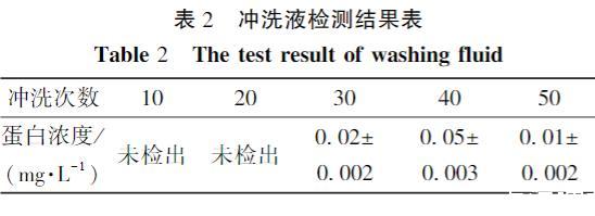 通過(guò)用生理鹽水對(duì)材料進(jìn)行浸泡、多次沖洗,檢測(cè)覆層4層羥基磷灰石材料中膠原蛋白肽的泄露,來(lái)評(píng)價(jià)生物覆層材料的穩(wěn)定性。對(duì)收集的浸泡液、沖洗液濃縮100倍,通過(guò)微量Lowry法檢測(cè)其蛋白濃度,在浸泡液中未檢出膠原蛋白肽,沖洗液檢測(cè)結(jié)果見(jiàn)表2。從表中結(jié)果可以看出隨著沖洗次數(shù)增多,泄露的膠原蛋白肽呈現(xiàn)先增加后減少的趨勢(shì),說(shuō)明覆層的膠原蛋白肽會(huì)有一定的脫落,但不會(huì)一直脫落,經(jīng)折算,脫落膠原蛋白肽總量?jī)H占覆層總量的0.01%,因此制備的覆層材料是穩(wěn)定可靠的。
