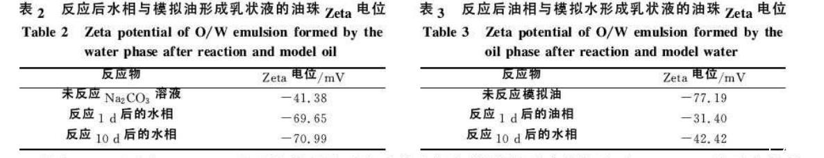 由表2可以看出,Na2CO3溶液與模擬油反應(yīng)后的水相與模擬油形成乳狀液,與Na2CO3溶液和模擬油直接乳化形成的乳狀液相比,油珠Zeta電位絕對(duì)值明顯增大;反應(yīng)10d的與1d的相比,變化很小。這是由于Na2CO3溶液與模擬油反應(yīng)后生成一些界面活性物質(zhì)溶于水相中,電離后帶負(fù)電荷,與模擬油乳化時(shí),帶負(fù)電荷的界面活性物質(zhì)吸附在油珠表面上,使油珠表面帶更多負(fù)電荷,從而使油珠Zeta電位絕對(duì)值增大。隨著反應(yīng)時(shí)間的延長(zhǎng),生成的界面活性物質(zhì)逐漸增多,油珠Zeta電位絕對(duì)值也繼續(xù)增大,但增大的幅度很小。