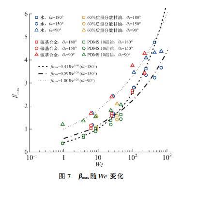 本文在毛細(xì)力區(qū)研究的流體包括水、60%質(zhì)量分?jǐn)?shù)甘油溶液、PDMS10硅油和鎵基合金,βmax隨We變化的情況如圖7所示。對(duì)不同潤(rùn)濕性壁面的模擬結(jié)果進(jìn)行擬合,如圖7中虛線所示:當(dāng)θe=90°時(shí),βmax∝We0.26(R2=0.921);當(dāng)θe=180°時(shí),βmax∝We0.40(R2=0.990);當(dāng)θe=150°時(shí),βmax∝We0.29(R2=0.918),介于前兩者之間。因?yàn)檎鎸?shí)表面無法絕對(duì)疏水,所以Clanet等實(shí)驗(yàn)研究結(jié)果βmax∝We0.25更接近本文θe=90°的模擬結(jié)果,而Eggers等針對(duì)完全疏水表面提出的βmax∝We0.5更適用于θe=180°的情況。