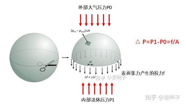 而這里有一件非常關鍵的事請,就是由于表面張力的存在,彎曲的表面就會在兩側形成壓力差。就好像緊繃的氣球,其內部壓力要高于外部的壓力。這種壓力差來自哪里?當然就是氣球皮膜緊繃的張力。由于氣球的彎曲表面,使得其張力最終表現為內部壓力的升高。