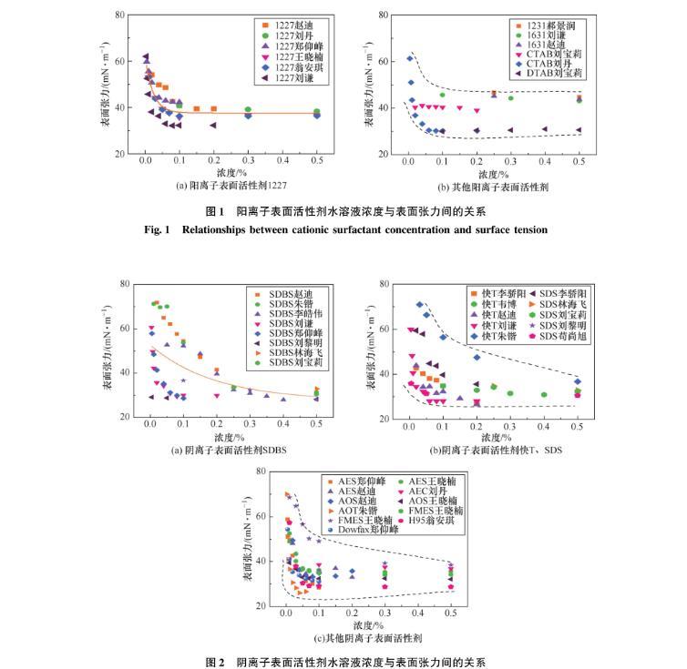 采用文獻(xiàn)調(diào)查法,匯總分析了82組不同類型表面活性劑水溶液濃度與表面張力的對(duì)應(yīng)關(guān)系[19-34],如圖1~圖4所示。
