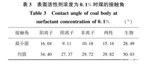 以接觸角作為判斷潤(rùn)濕的標(biāo)準(zhǔn),接觸角越小則潤(rùn)濕性能越好。表面活性劑濃度為0.1%時(shí),煤巖接觸角統(tǒng)計(jì)結(jié)果見(jiàn)表3。當(dāng)活性劑水溶液濃度為0.1%時(shí),陰離子表面活性劑AES水溶液與煤的接觸角最小為9.11°。進(jìn)一步將不同類型表面活性劑水溶液在濃度為0.1%時(shí)與煤的接觸角進(jìn)行均值化處理可發(fā)現(xiàn),陽(yáng)離子、陰離子、非離子、兩性及生物表面活性劑水溶液與煤的接觸角平均值分別為34.4°、27.37°、29.72°、29.82°和50.03°。因此,表面活性劑潤(rùn)濕性效果排序?yàn)椋宏庪x子表面活性劑>非離子表面活性劑>兩性表面活性劑>陽(yáng)離子表面活性劑>生物表面活性劑。