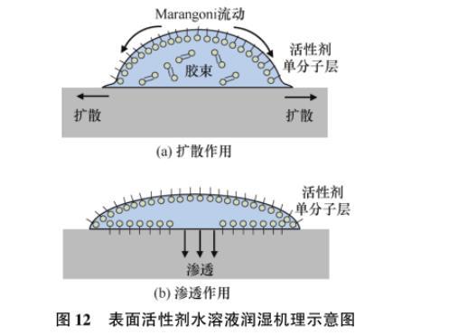 如圖12(a)所示,表面活性劑分子在氣-液界面的吸附行為影響著溶液的擴散。表面活性劑分子自發地從溶液內部遷移至表面,其尾部憎水基會以伸出的方式在溶液表面形成活性劑單分子層,使水溶液的表面張力下降。由于在一相或兩相中,一個或多個組分在此局域(界面)的濃度與本體相中的濃度不同,所產生的張力梯度會引起界面上的質量傳遞即Marangoni流動效應,進而會導致液滴前沿不斷擴散[42-43],在擴散作用下進一步促使液體與固體之間的接觸面積增大,從而降低接觸角。