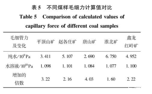 毛細管力與溶液表面張力成正比、與孔隙半徑成反比;同時,接觸角越小,毛細管力越大。由表5可知,朱鍇[21]試驗并計算煤樣10 nm孔徑的毛細力,發現自配的表面活性劑水溶液能夠使毛細力平均提高2倍,最大提高4.03倍。如圖13所示,在擴散、滲透和毛細力共同作用下,表面活性劑水溶液沿著煤體表面、孔隙和裂隙進入煤體內部產生液相滯留效應,增大煤潤濕效果的同時其內部瓦斯流動阻力變大,孔隙內瓦斯氣體被水溶液封堵。因此,添加活性劑水溶液能夠減小水溶液的表面張力、降低水溶液與煤之間的接觸角,增強煤的潤濕效果,達到抑制煤層瓦斯的解吸、延緩采動煤巖體中瓦斯逸散的目的,從而降低開采工作面瞬時瓦斯涌出量。也有學者[21,29,32]分析認為,添加表面活性劑水溶液會降低煤體溫度、增強煤吸附瓦斯的能力,使得部分游離態瓦斯轉變為吸附態,相應地減少了瓦斯氣體的逸散涌出。