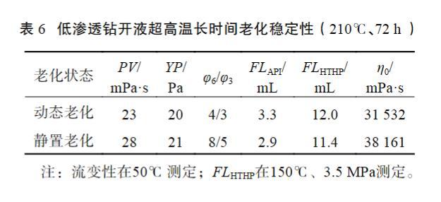表6低滲透鉆開液超高溫長時(shí)間老化穩(wěn)定性(210℃、72 h)