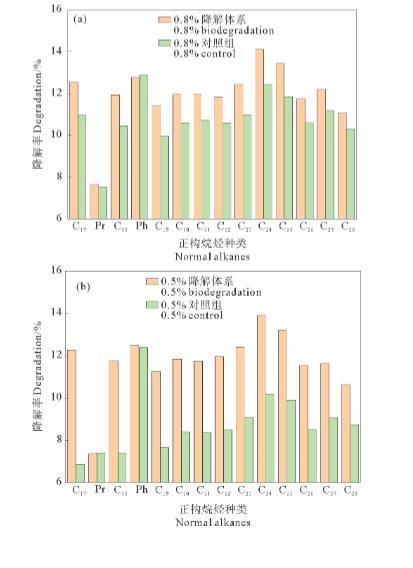 圖2油濃度為0.8%(a)、0.5%(b)和0.3%(c)的培養體系中正構烷烴的中等碳數組分降解率