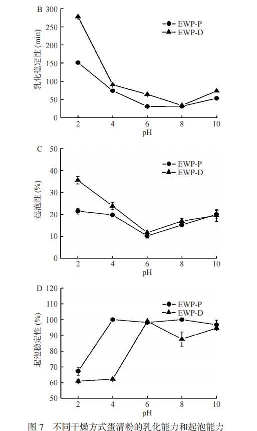 泡沫的形成依賴于由蛋白質形成的界面膜及其在懸浮液中保持氣泡和減緩聚結速率的能力,其中蛋白質的發泡能力和穩定性與蛋白與水相在界面上的相互作用有關,受蛋白分子柔性、凈電荷、構象和疏水性的影響。蛋清蛋白在pH2.0~10.0條件下的起泡性如圖7C所示,EWP-D的起泡性優于EWP-P,這可能是由于EWP-D的溶解度較高,在起泡過程中蛋白能迅速展開,形成能同時連接水相溶劑與空氣界面的兩性介質,而自身的帶電性又可產生一定的靜電排斥,使蛋白分子在空氣-水界面上呈現規律性排列,而不會發生聚集。相比之下,EWP-P在高溫發生的美拉德反應會使蛋白形成更大的空間位阻,進而延緩了蛋白質在空氣/液體界面的吸附。pH為6.0時,EWP-P和EWP-D的起泡性較低,分別是10.19%±1.01%和11.7%±0.66%,這是由于該pH下蛋白的溶解度和表面張力較低,蛋白易發生聚集,故不易形成泡沫。