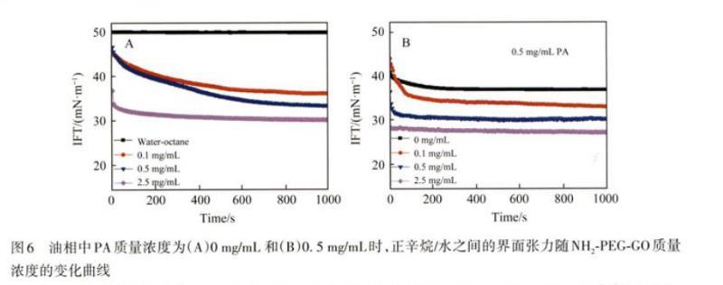 圖6油相中PA質(zhì)量濃度為(A)0 mg/mL和(B)0.5 mg/mL時,正辛烷/水之間的界面張力隨NH2-PEG-GO質(zhì)量濃度的變化曲線