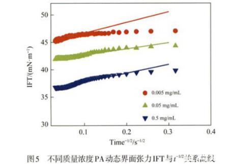 圖5不同質(zhì)量濃度PA動態(tài)界面張力IFT與t-1/2關(guān)系曲線