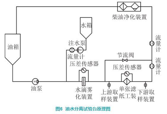 油水分離試驗臺的原理如圖6所示。通過向水滴霧化裝置上游管路內(nèi)按質(zhì)量比0.15%的比例注水,油水混合物通過孔板裝置后柴油中的水會破散成更小的水滴,通過控制水滴霧化裝置兩端的壓差可以得到不同粒徑分布的水滴,調(diào)節(jié)壓差得到合適粒徑分布的水滴進(jìn)行油水分離效率試驗。