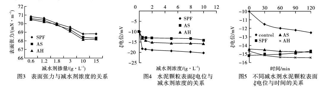 從圖3可知,SPF、AS和AH3種高效減水劑溶液的表面張力隨著高效減水劑濃度的增大而減小,SPF減水劑能降低水的表面張力,但沒有AS、AH降低得多,其主要原因是AS、AH在氣液界面的取向能力大且對(duì)混凝土有一定的引氣作用,而SPF不能明顯降低溶液表面張力,其對(duì)水泥顆粒分散作用中濕潤(rùn)作用貢獻(xiàn)較小。